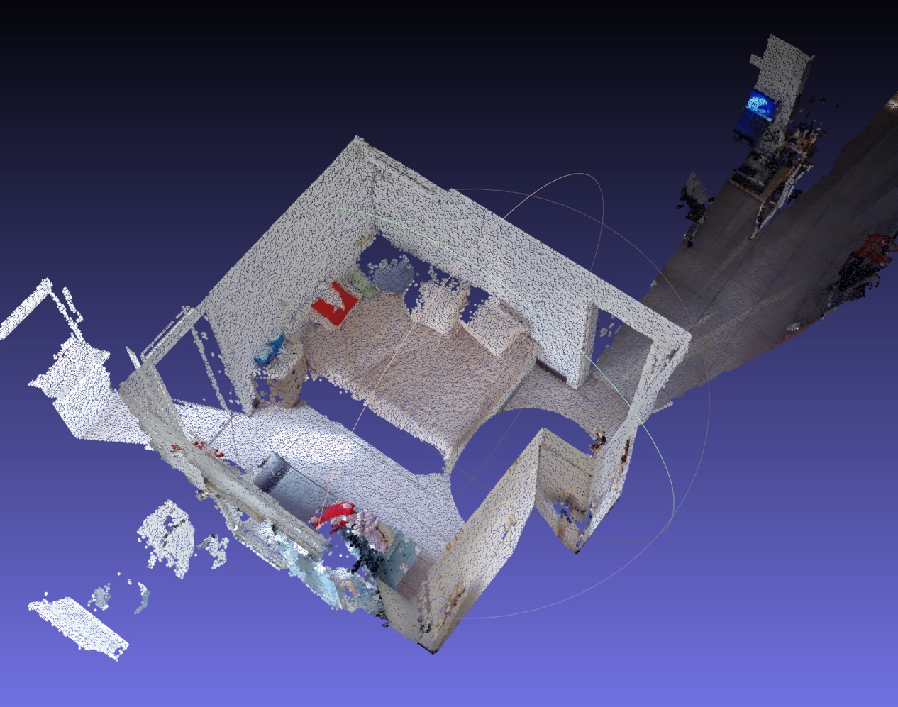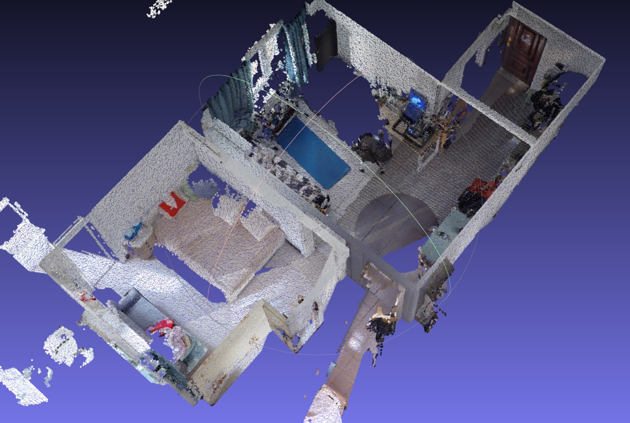(2)點云數據不完整與遮擋:因采集設備視角限制,或現(xiàn)場實際環(huán)境的影響,點云數據有時存在局部缺失或遮擋。比如,針對房屋數據采集的場景,基于結構光原理的三維采集設備會收到太陽光線的影響,所以在靠近窗戶陽臺等存在太陽光源環(huán)境時,就會無法計算出準確數據信息而造成數據的部分缺失;再比如在一些凌亂的狹小的房間里,能夠供采集設備擺放的空間很有限,而室內的物品又凌亂,就會造成物品之間的遮擋而產生數據確實。