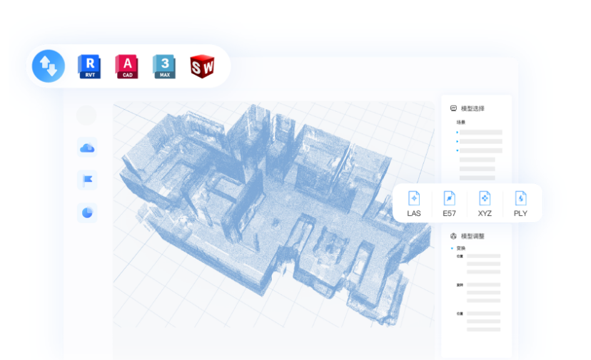 同時(shí),可開放集成三方三維模型、全景照片、虛擬模型、傾斜攝影模型等多元數(shù)據(jù),支持 Ply、E57、XYZ、LAS 等點(diǎn)云格式文件導(dǎo)出,無縫銜接 BIM/CAD 等專業(yè)軟件,真正讓行業(yè)用戶能夠有所選,有所用。