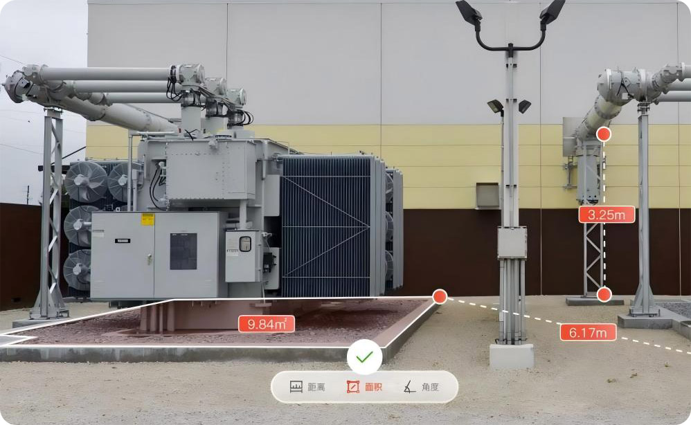 無需現(xiàn)場人工測量,即可在模型中對任意兩點距離、設(shè)備占地面積、導(dǎo)線安全距離等進行高精度量算。